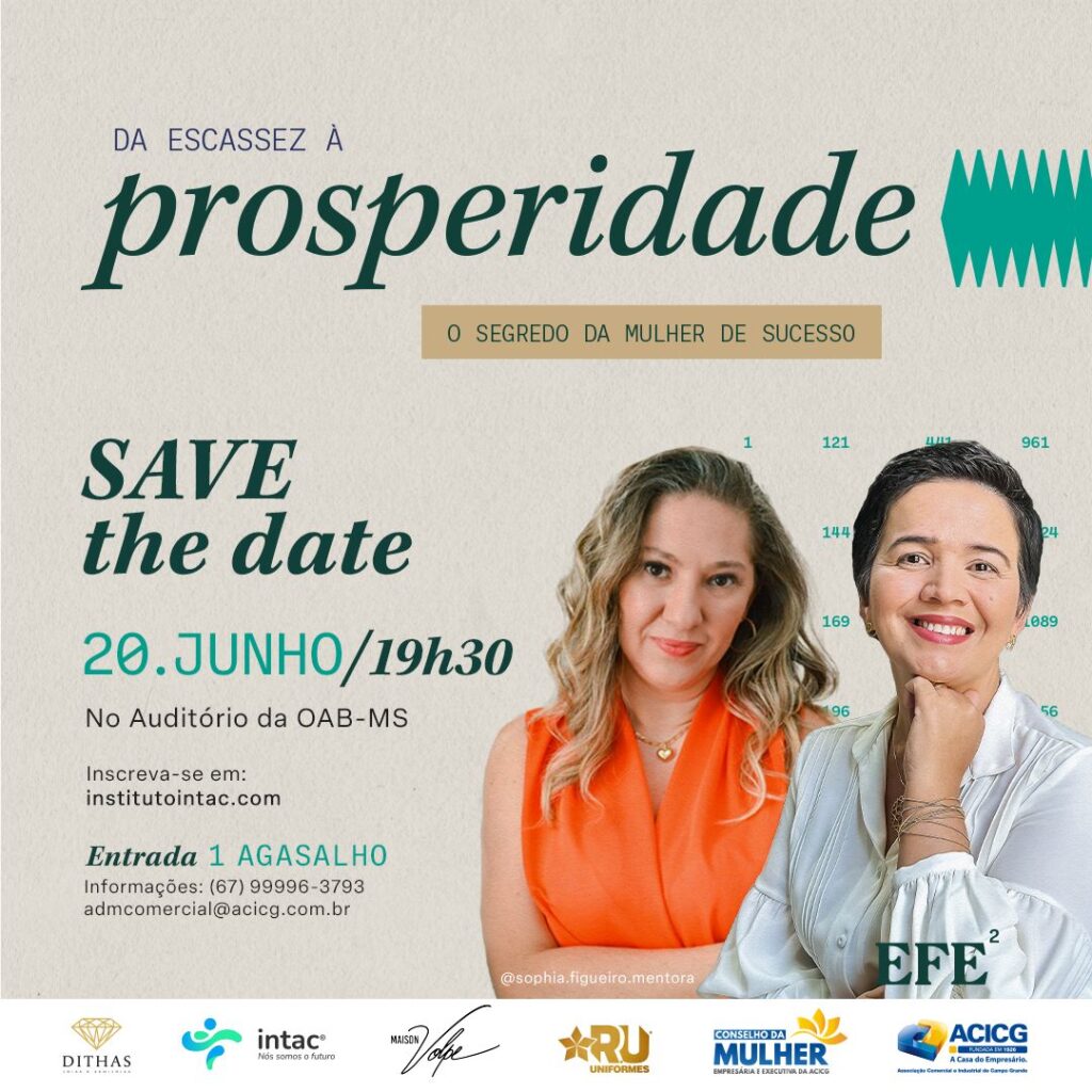 O evento é idealizado pelo Conselho da Mulher Empresária e Executiva da ACICG, com o apoio da Comissão da Mulher da OAB-MS e Senac Hub Academy. Estão abertas as inscrições para a palestra “Da escassez à prosperidade – o segredo da mulher de sucesso”, que acontecerá no dia 20 de junho, das 19h30 às 21h30, na sede da OAB/MS (Ordem dos Advogados do Brasil) – Seccional Campo Grande. A entrada será a doação de um agasalho. Realizado pelo Conselho da Mulher Empresária e Executiva da Associação Comercial e Industrial de Campo Grande (ACICG), o evento será ministrado pela educadora financeira Maria Fernanda Figueiredo e a neuropsicopedagoga Sophia Gomes Figueiró, que irão abordar como a saúde mental e a saúde financeira estão conectadas e impactam a vida do público feminino. Além disso, vão tratar sobre a mentalidade das mulheres de sucesso. “Alguns estudos mostram que ter dívidas podem causar ansiedade, depressão, baixa autoestima e outros pensamentos negativos. Por outro lado, os problemas de saúde mental podem dificultar a tomada de decisões financeiras, aumentar o consumo impulsivo e o risco de endividamento e de inadimplência. Portanto, é importante identificar atitudes sabotadoras, saber como lidar com a situação para ter uma vida mais equilibrada e próspera”, explica Sophia Gomes Figueiró, uma das palestrantes do encontro. A coordenadora do Conselho da Mulher Empresária e Executiva da ACICG, Juliana Aranda, esclarece que a palestra vai inspirar e orientar as participantes a como transformar a mentalidade e os hábitos, tendo como exemplo referências das mulheres de sucesso, para que possam realizar seus projetos com mais liberdade e segurança. “Queremos proporcionar para as mulheres mais conhecimento, pois melhor instruídas elas podem ter mais autonomia, fazer escolhas mais assertivas e alcançar a prosperidade na carreira, no mercado de trabalho, empreendendo em seus negócios ou no campo pessoal”, declara Juliana. As inscrições para o evento “Da escassez à prosperidade – o segredo da mulher de sucesso” podem ser feitas pelo link ou pelo telefone (67) 99996-3793. A palestra também conta com o apoio da Comissão da Mulher da OAB-MS e Senac Hub Academy. Além de proporcionar conhecimento, o evento tem finalidade social. Os agasalhos arrecadados serão destinados à Sirpha – Lar do Idoso. Serviço Palestra “Da escassez à prosperidade – o segredo da mulher de sucesso” Data: 20 de junho de 2023 Horário: 19h30 Local: OAB-MS – Avenida Mato Grosso, 4700 – Carandá Bosque Entrada um cobertor ou agasalho Inscrições: link